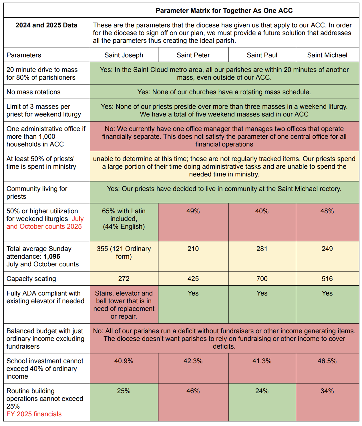 Below is a link to see the grid matrix of the decision making process of how our 4 parishes are (or are not) hitting the parameters that the Saint Cloud Diocese has given to all of the ACC’s.