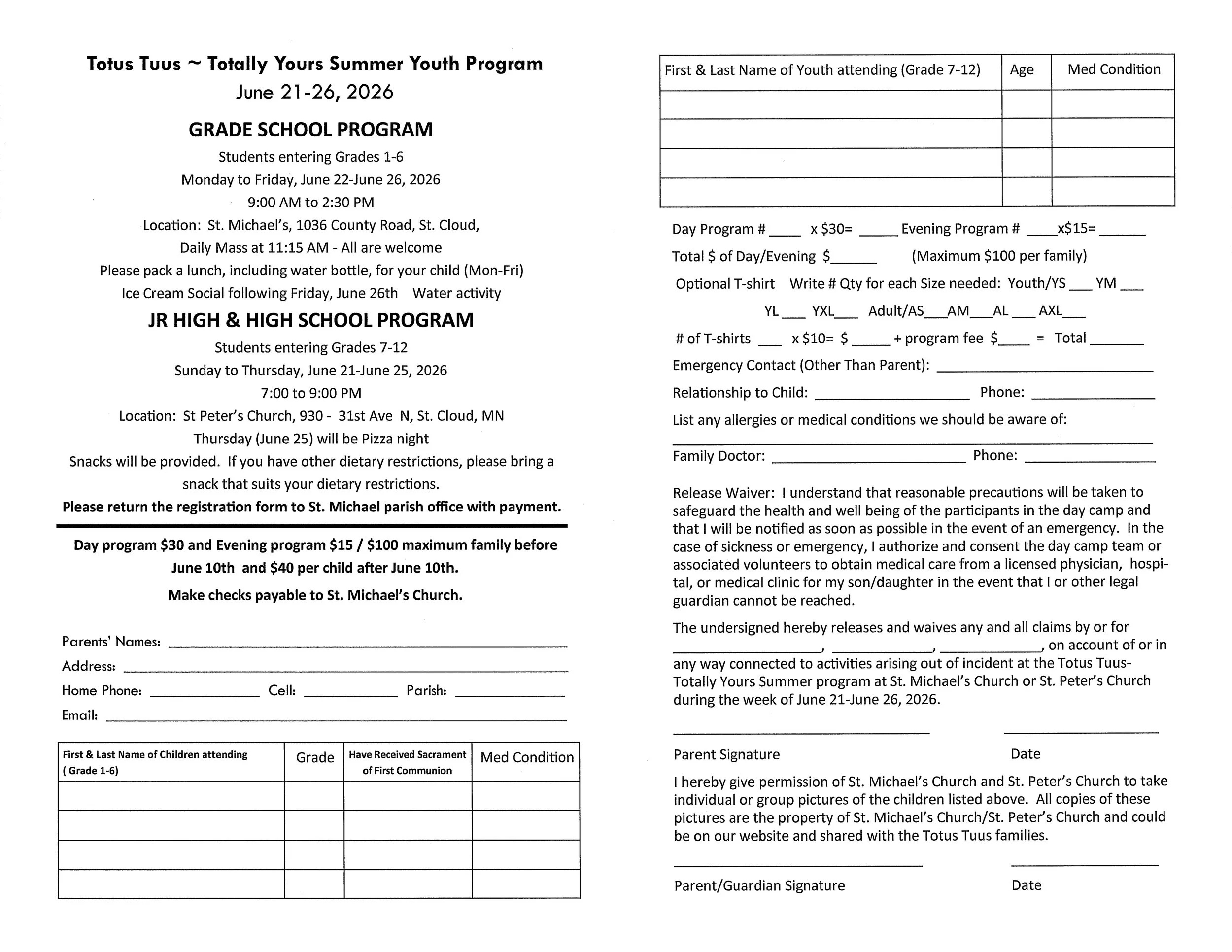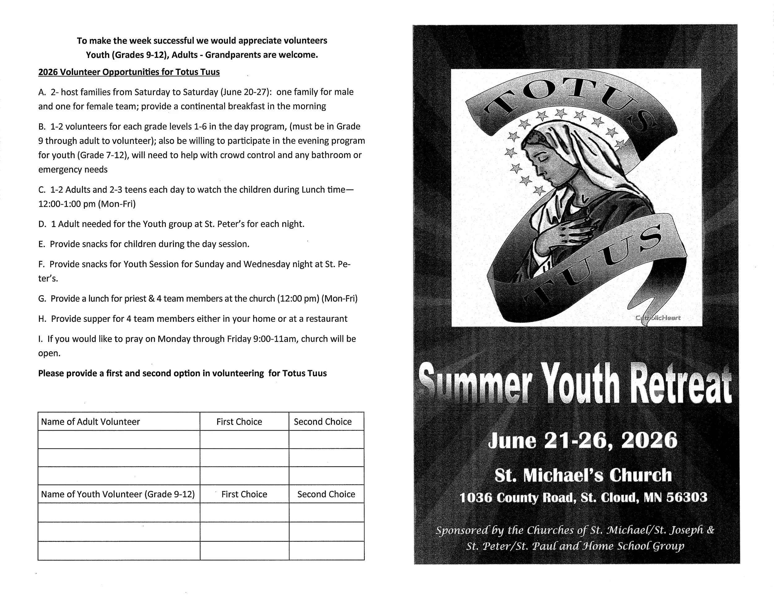 Totus Tuus - Totally Yours Summer Youth Camp Sunday, June 21, 2026 7:00 PM Friday, June 26, 2026 2:30 PM Google Calendar ICS